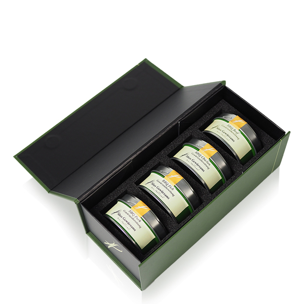 Edle Geschenkbox mit hochwertigem Schaumstoff-Inlay | Abmessung (L/T/H): 22,0 cm × 9,0 cm × 7,5 cm | Allergenkennzeichnung: Senf, Spuren möglich: Sellerie | Aufbewahrungshinweis: dunkel, trocken, kühl und luftdicht verschlossen lagern; nicht über oder direkt neben dem Herd aufbewahren, da Wärme und Feuchtigkeit das Aroma vermindern können
