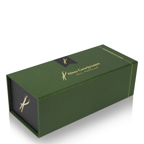 Mit dieser Geschenkbox kaufen Sie eine stabile, hochwertig verarbeitete Geschenkverpackung, die drei große Gewürzdosen von Altes Gewürzamt aufnimmt. Die Box ist aus festem Karton gefertigt, passt exakt für die klassischen grünen Dosen und ermöglicht eine ansprechende Präsentation einzelner Gewürze oder individuell zusammengestellter Sets. Das Erscheinungsbild ist bewusst schlicht gehalten: hochwertige Haptik, klare Linien, dezente Farbgebung.
