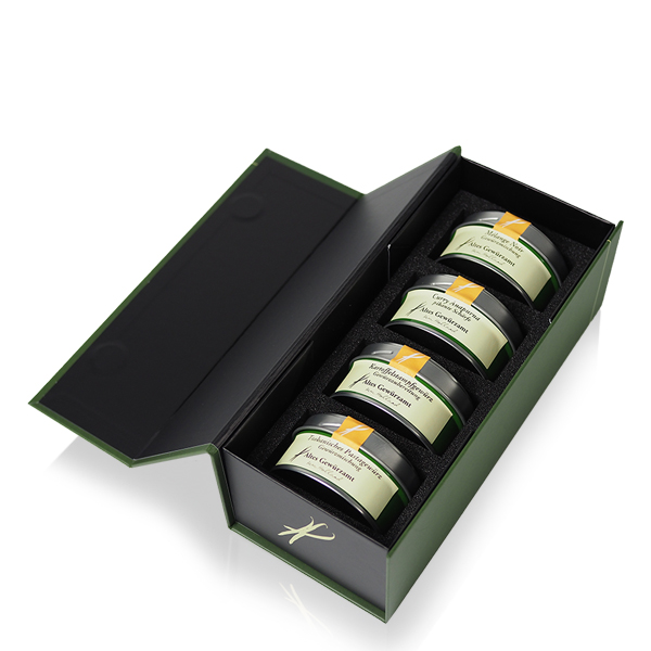 Edle Geschenkbox mit hochwertigem Schaumstoff-Inlay | Abmessung (L/T/H): 22,0 cm × 9,0 cm × H 7,5 cm | Allergenkennzeichnung: Sellerie, Senf | Aufbewahrungshinweis: dunkel, trocken, kühl und luftdicht verschlossen lagern; nicht über oder direkt neben dem Herd aufbewahren, da Wärme und Feuchtigkeit das Aroma vermindern können