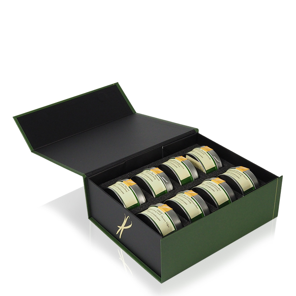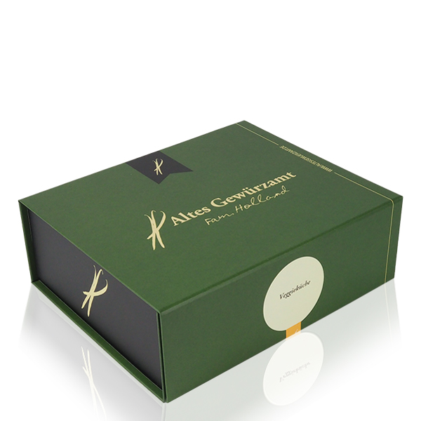 Edle Geschenkbox mit hochwertigem Schaumstoff-Inlay | Abmessung (L/T/H): 23,5 cm × 18,5 cm × 7,7 cm | Allergenkennzeichnung: enthält Senf, Erdnuss, Sellerie | Aufbewahrungshinweis: dunkel, trocken, kühl und luftdicht verschlossen lagern; nicht über oder direkt dem Herd aufbewahren, da Wärme und Feuchtigkeit das Aroma vermindern können