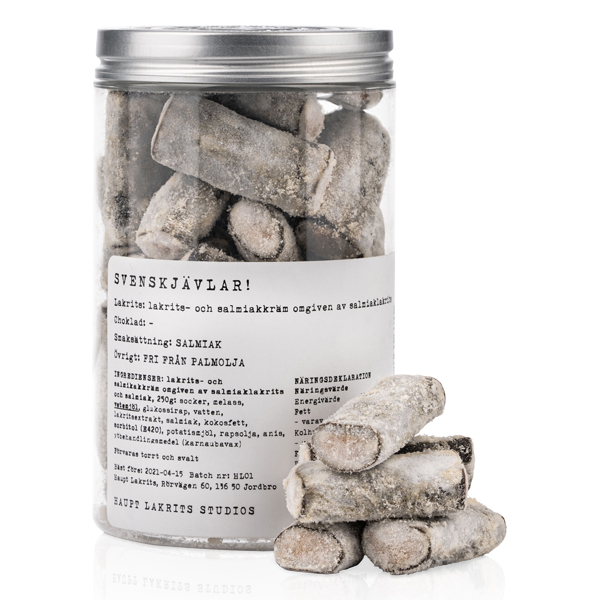 Mit dieser Lakritz von Haupt Lakrits kaufen Sie eine schwedische Spezialität für alle, die kompromisslos salzige Sorten lieben. Svenskjävlar! steht für einen weichen Kern aus Lakritz- und Salmiakcreme, umhüllt von einer besonders kräftigen Schicht mit ausgeprägter Salmiaknote. Das Ergebnis ist eine intensive, markante Lakritz mit echtem Wiedererkennungswert und genau dem Charakter, für den Haupt Lakrits bekannt ist.